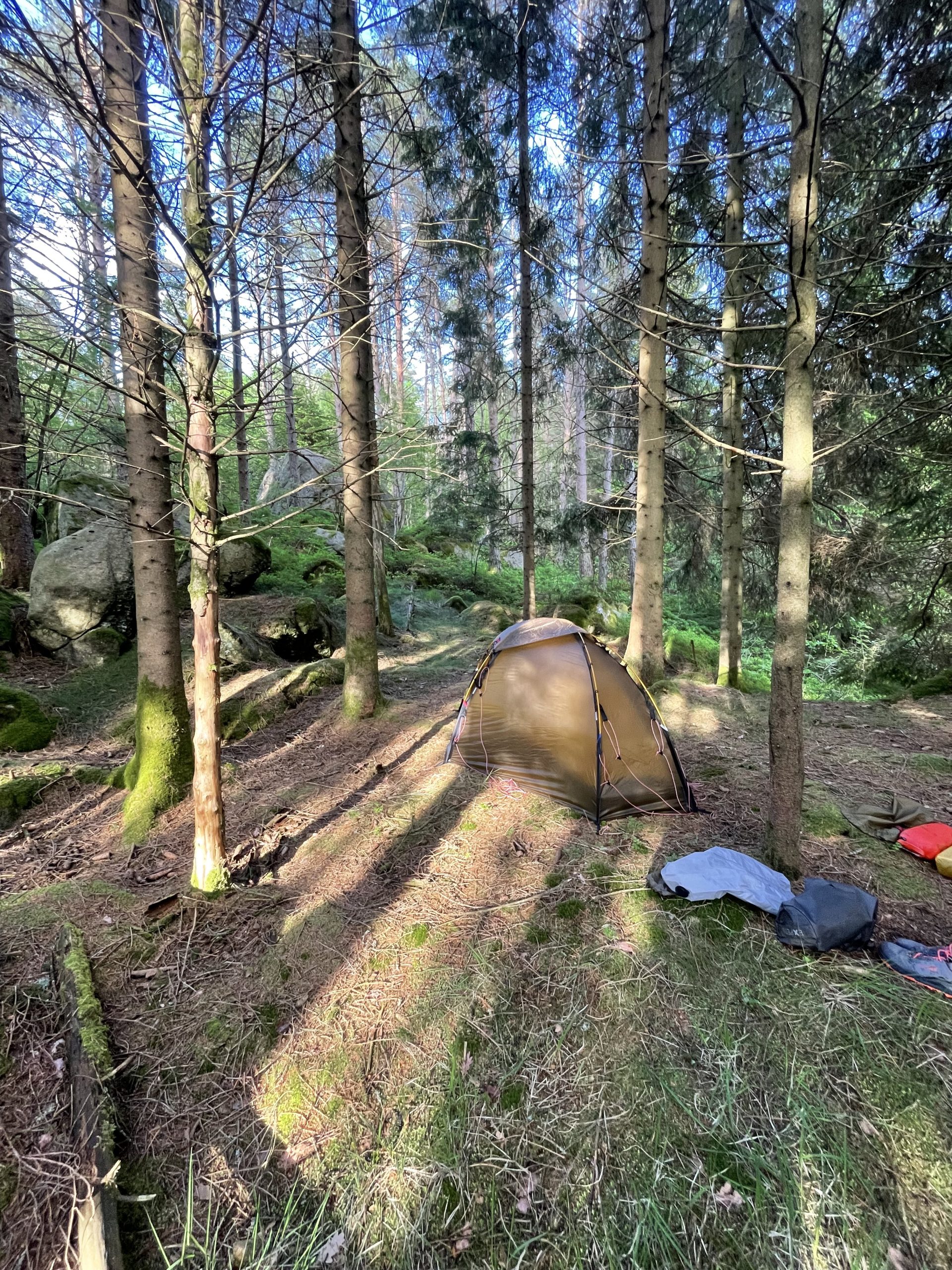 Warum der Tag heute schon bei 15,5km aufgehört hat? Zum einen will ich meinen Beinen Zeit geben sich langsam an die stetige Belastung zu gewöhnen und zum anderen habe ich zum Schluss einfach einen hervorragenden Zeltplatz gefunden! Zufällig kam dann noch der Besitzer des benachbarten Grundstücks zum Angeln vorbei. Seine Reaktion auf meine Aussage dass ich ans Nordkap wandere… „Ja so Verrückte kommen öfters bei mir vorbei“