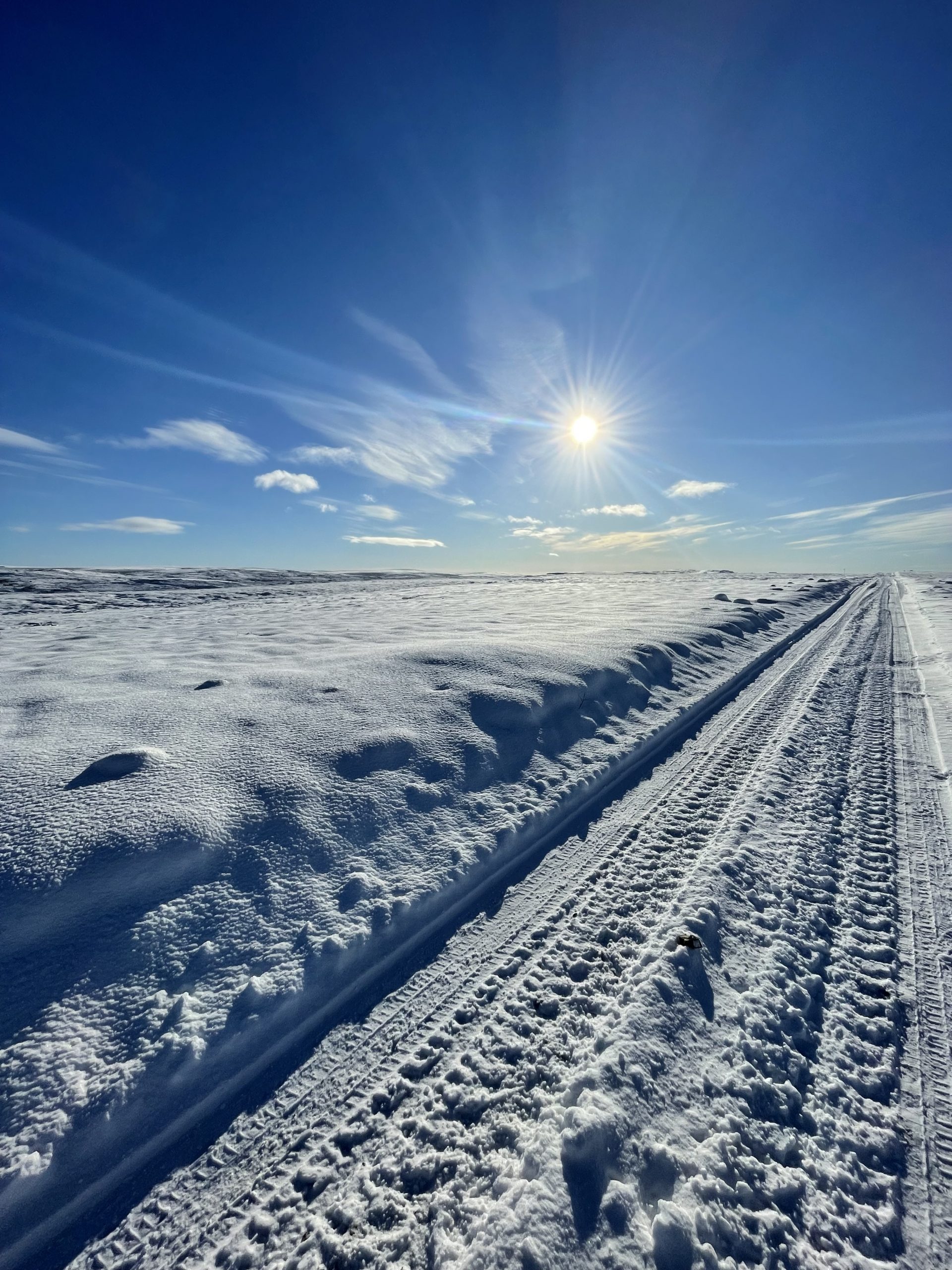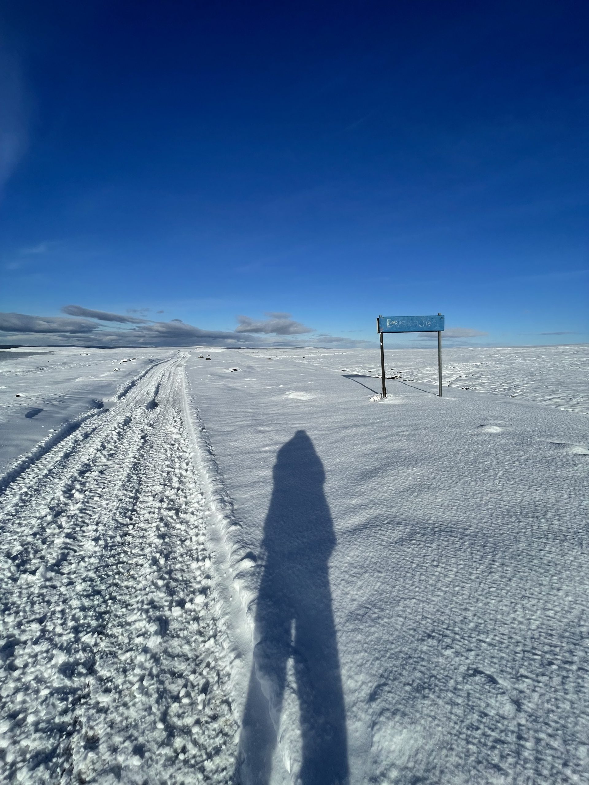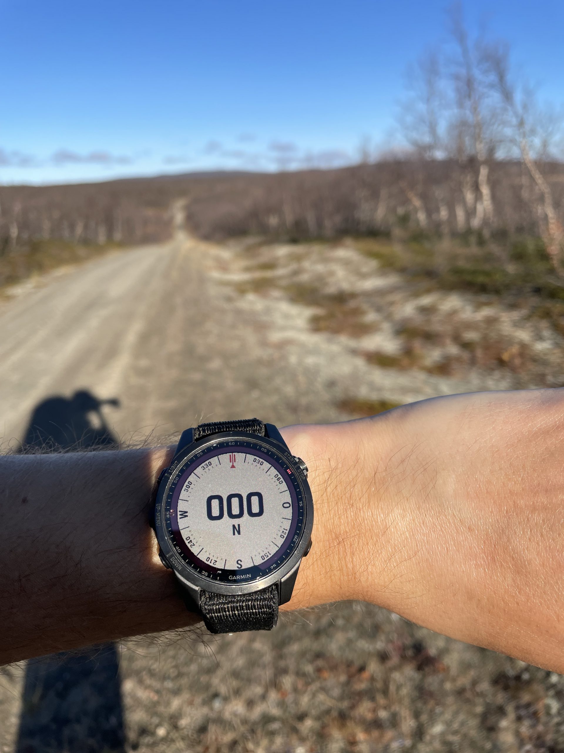 Endlich wieder in die richtige Himmelsrichtung! Der Kompass zeigt auf der ersten der vielen endlosen Schotterstraßen den direkten Norden an und damit geht’s auch auf der Weltkarte endlich wieder weiter in Richtung Nordkap. Und das bei bestem Wetter! Das Abwarten hat sich gelohnt.