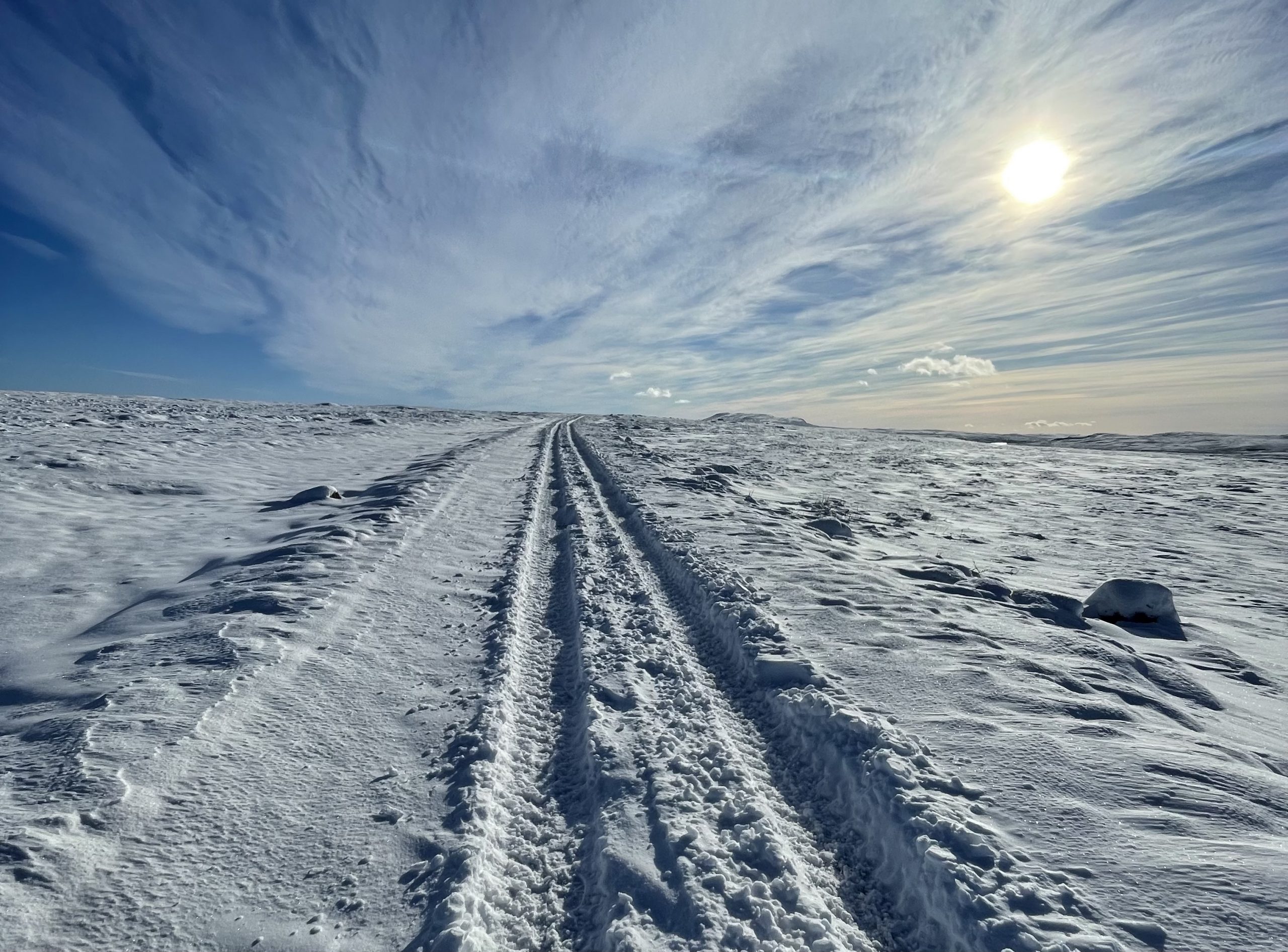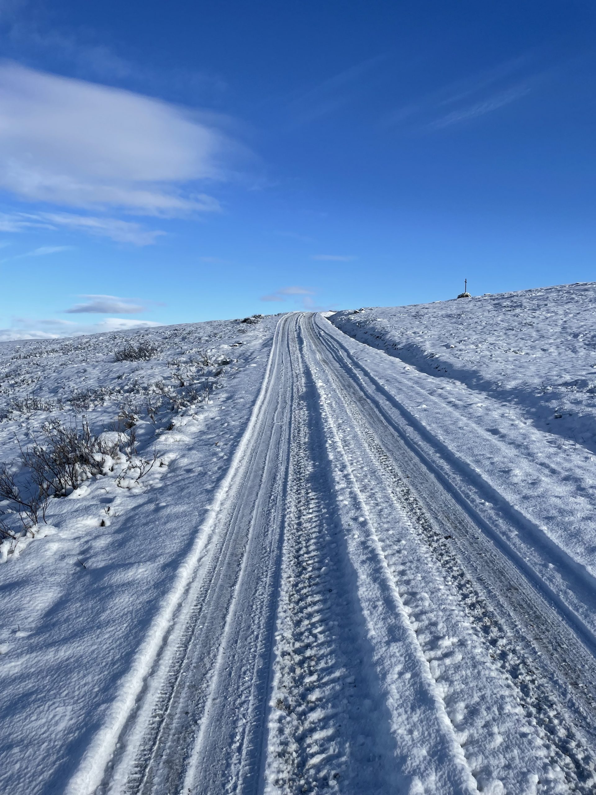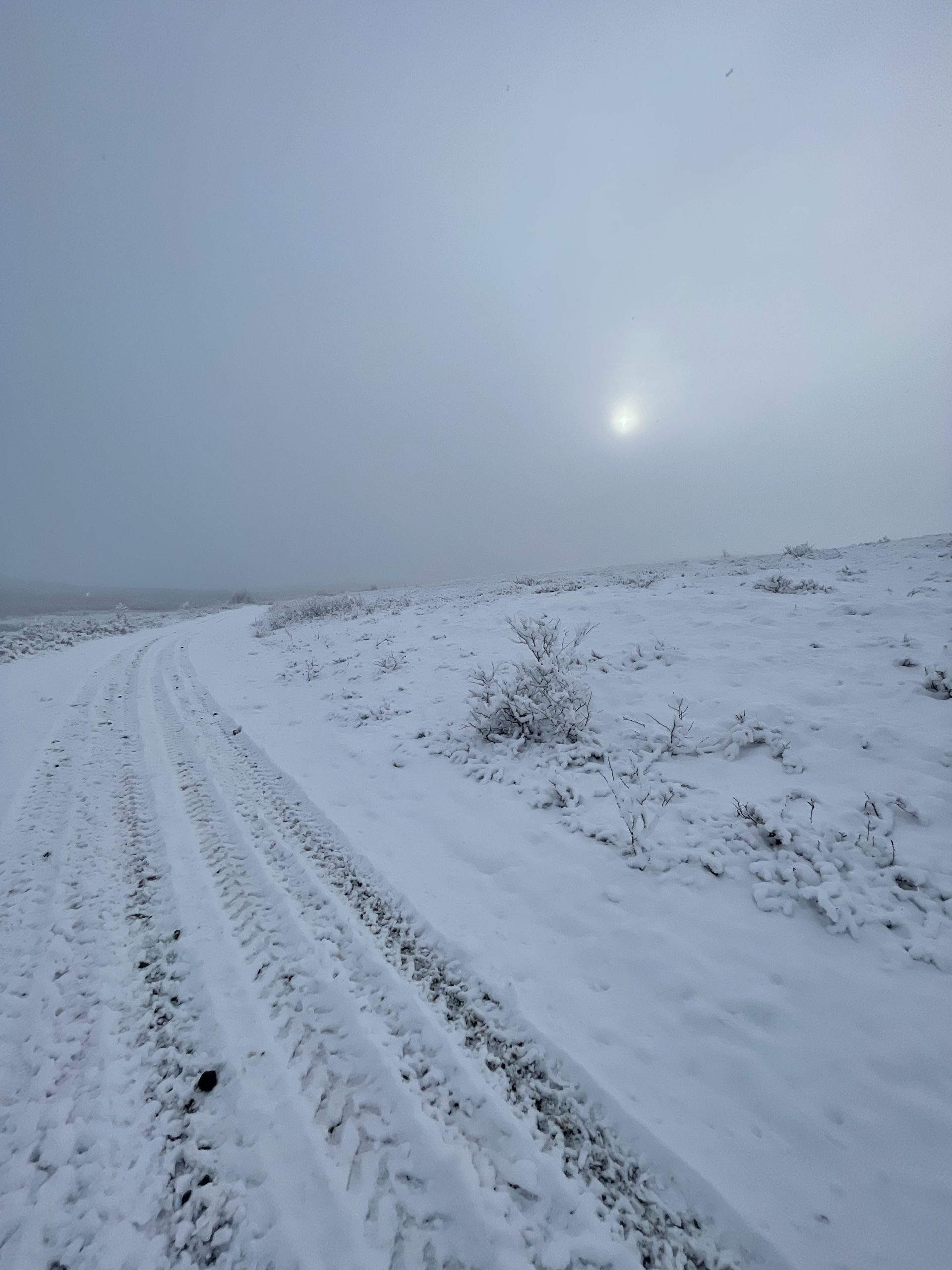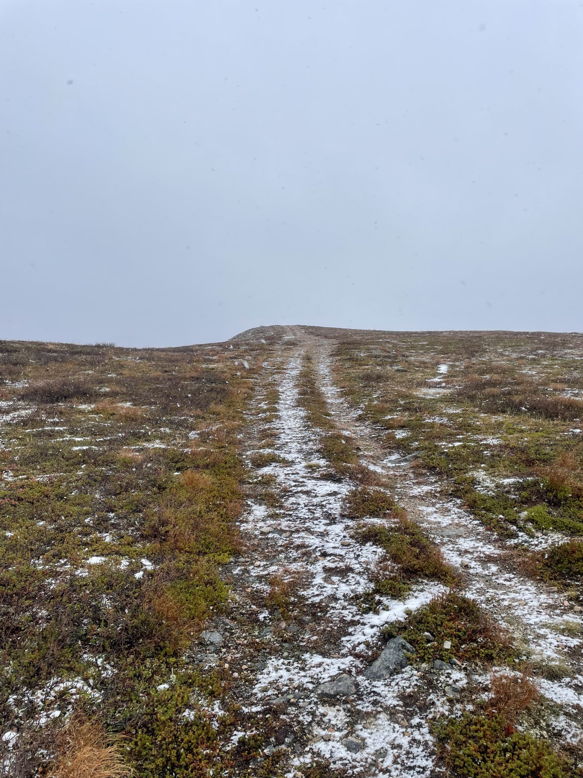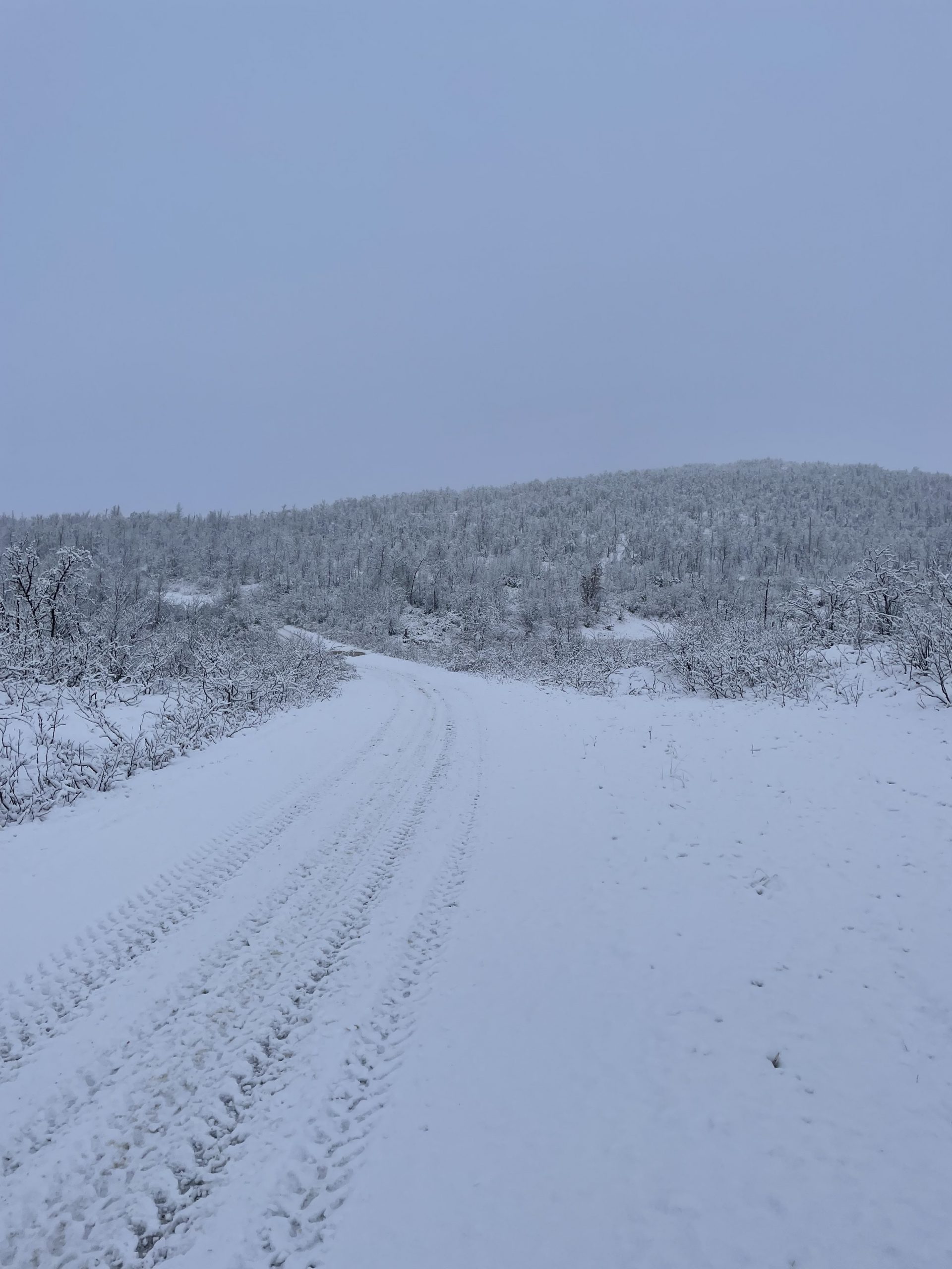 Es muss die ganze Nacht lang geschneit haben und selbst hier, auf 300m Höhe, bleibt fast alles liegen. Die Finnmark, welche ich gestern noch als trist bezeichnet habe, legt ein neues Kleid an… Winter Wonderland. Ich fühle mich wie in einer anderen Welt, als hätte sich über Nacht alles verändert! Aber es ist weniger eine Last als ein weiteres Highlight, welches ich so nicht erwartet habe. Plötzlich freue ich mich richtig drauf, heute durch den neuen Schnee zu stapfen! Auch wenn der weitere Weg sehr eintönig und geradlinig ist. Bis nach Alta führen mich Schotterstraßen und ATV-Spuren.
