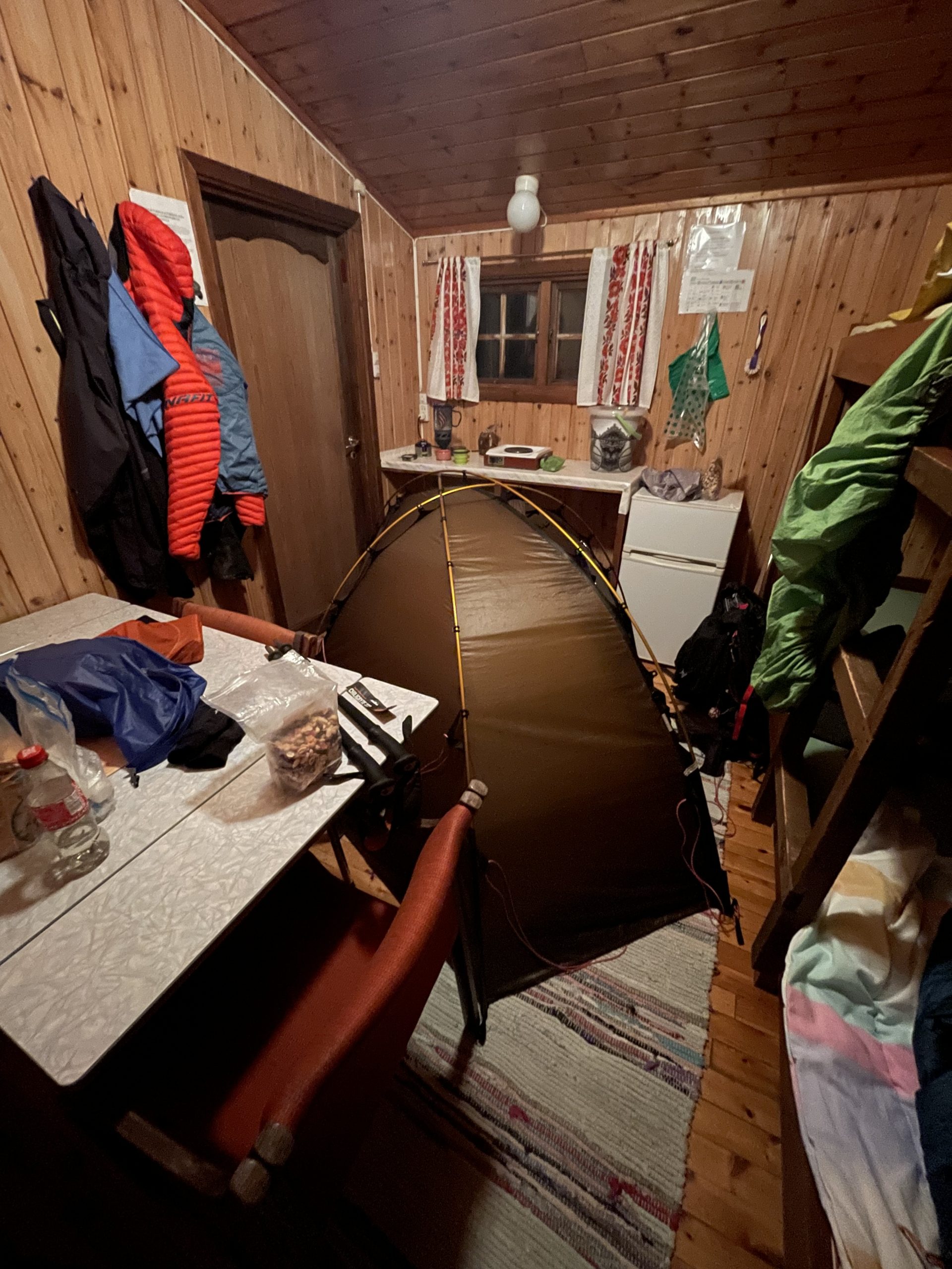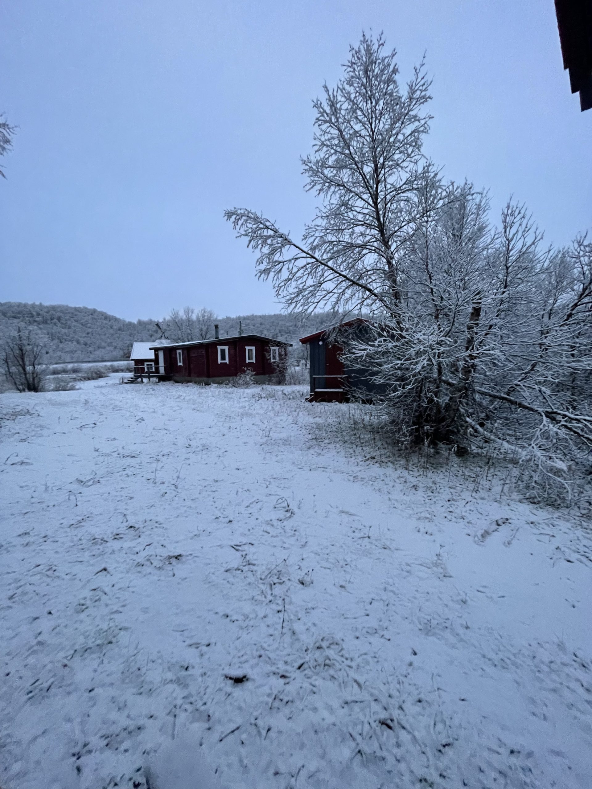 Kurze Zeit später beziehe ich meine Minihütte und verwandle die Bude in eine Trockenstube für mein Zelt. Jede! Möglichkeit dazu wird genutzt. Manchmal habe ich schon Mitleid mit den Hüttenvermietern… Aber trockenes Zelt geht vor, sorry! Und bevor ich die Hütte verlasse, wird auch immer brav aufgeräumt und geputzt. Bislang hat sich noch niemand über mich beschwert. Ich bin der Einzige, der gerade eine Hütte mietet und allgemein wirkt dieser Ort fast schon gespenstisch verlassen. Der Norden versinkt wohl allmählich in seinen langen Winterschlaf.
