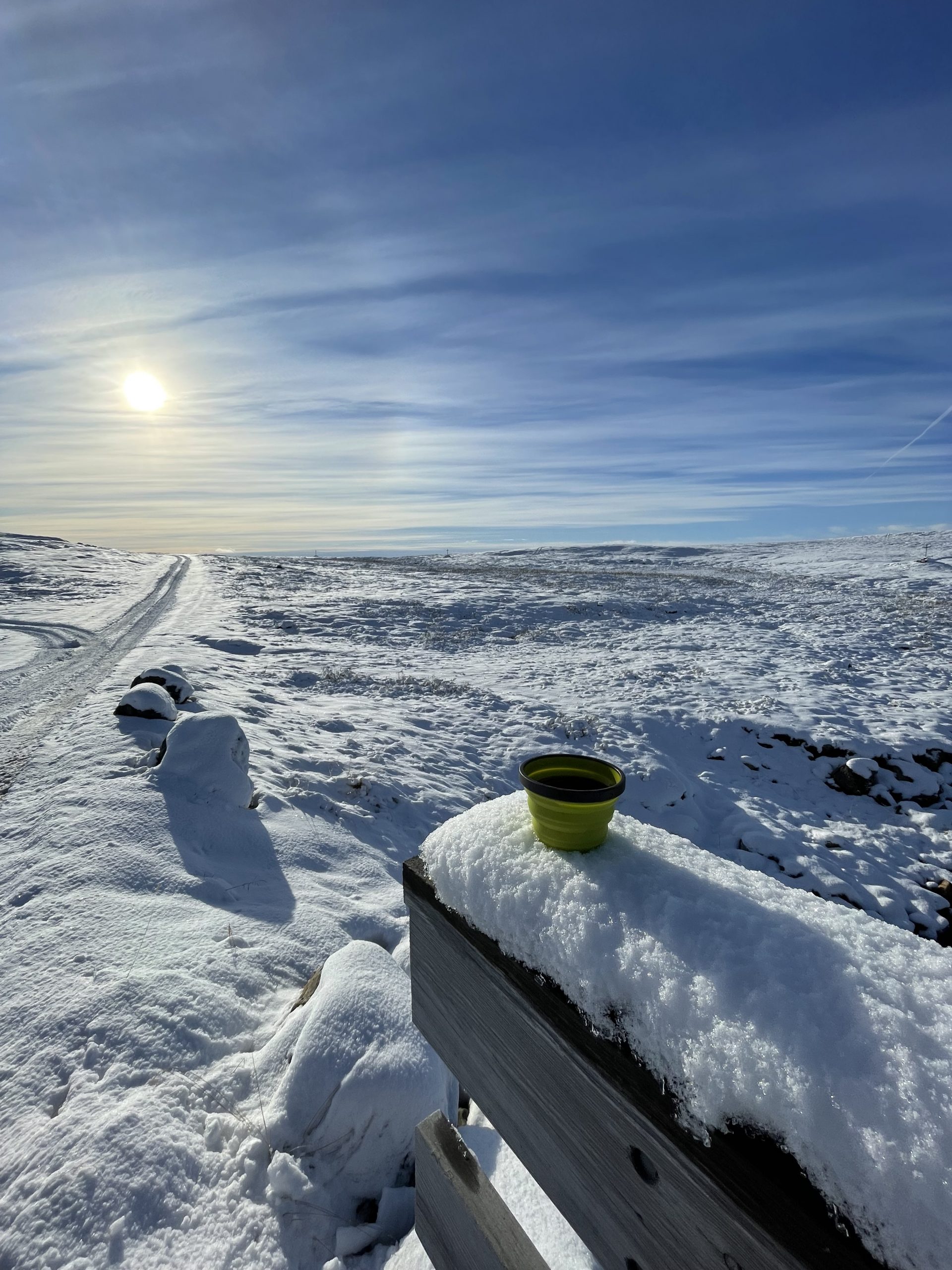 Ich liebe diesen Tag einfach! Mit allem Drum und Dran! Bestes Wetter, wenig bis gar kein Wind und einfach nur diese endlose weiße Weite. Dazu gibt es noch die beste Kaffee Pause seit Langem, ohne dabei auszukühlen! Ich genieße den Moment mit allen Sinnen. Durch die Spuren im Schnee, ist das Wandern auch mehr Genuss als Anstrengung. Ich mache schnellen Fortschritt und komme am Ende, als es wieder ins Tal hinab geht, auf gute 34km heute, Alta ist damit in leicht erreichbarer Nähe für Morgen!