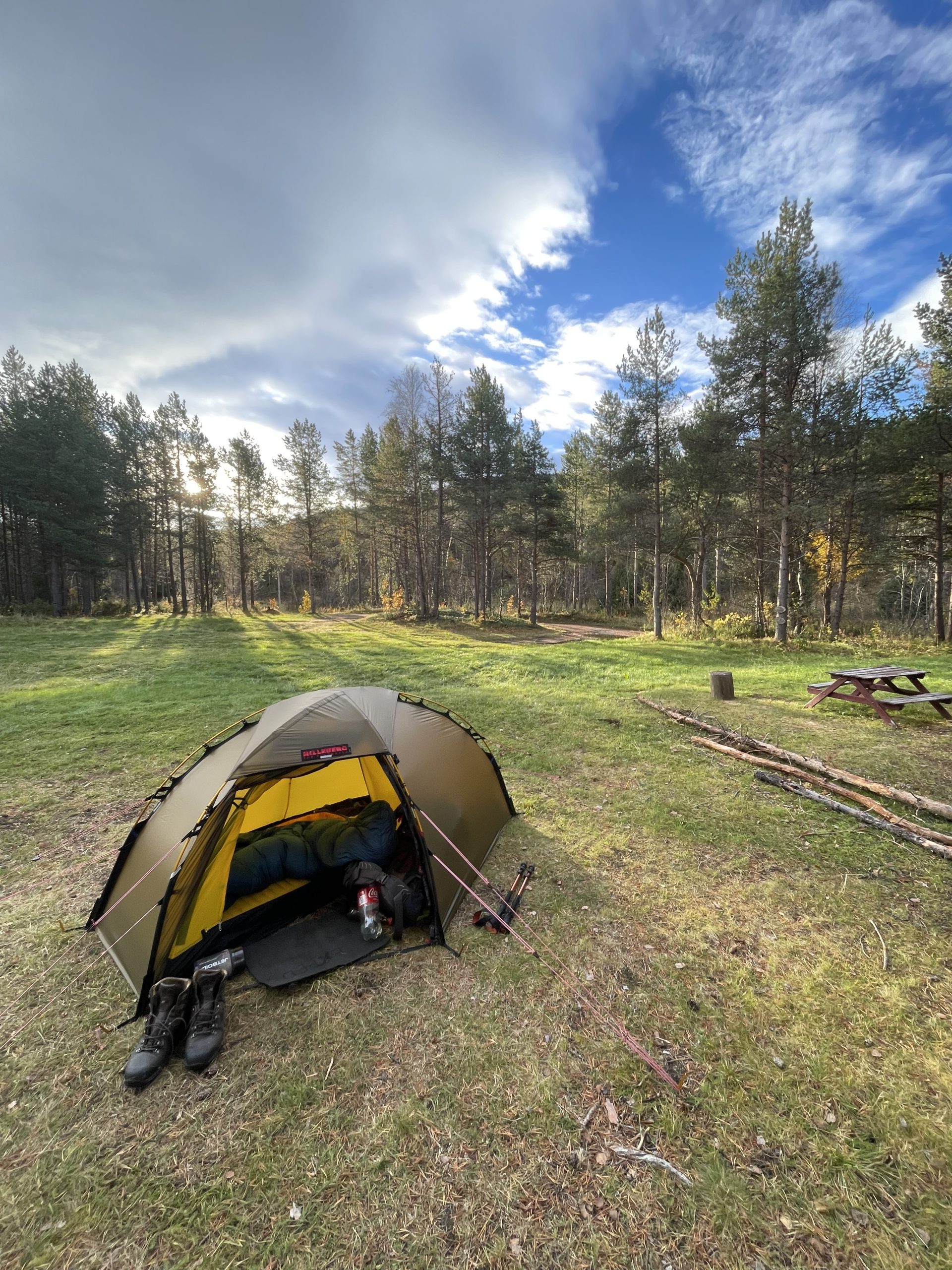 Nach starken 36km und dem Gefühl, endlich wieder Fortschritt zu machen, finde ich meinen Zeltplatz für heute Nacht an perfekter Stelle. Flache Stelle, wenig Büsche und ein Bach fürs Wasser direkt daneben. Da sagt der Wanderer doch nicht nein und lässt sich vor dem Verschwinden im Zelt noch vom abendlichen Farbenspiel am Himmel beeindrucken. Es kündigt sich eine kalte und windstille Nacht an und das Außenzelt ist schon vor dem Schlafengehen leicht angefroren… Ich befürchte die Verwandlung meines Innenzelts in eine Tropfsteinhöhle wegen Kondenswasser. Naja, dass es ab jetzt kein Sonntagscamping mehr sein wird, war ja abzusehen. Insbesondere bei diesen Übergangstemperaturen von -2° bis 2°, kann es wirklich widerlich werden im Zelt. Durch mangelnde Luftzirkulation bleibt die Feuchtigkeit, welche ich beim Schlafen ausatme, im Zelt und schlägt sich dann am Schlafsack und der Decke des Innenzelts nieder. Die Wärmeisolation meines Schlafsacks ist davon glücklicherweise (noch) nicht beeinträchtigt, aber nach 3 solcher Nächte in Reihe ist einfach alles feucht und klamm. Die Notwendigkeit, jede Chance zum Trocknen meiner Sachen zu nutzen, wird immer größer.