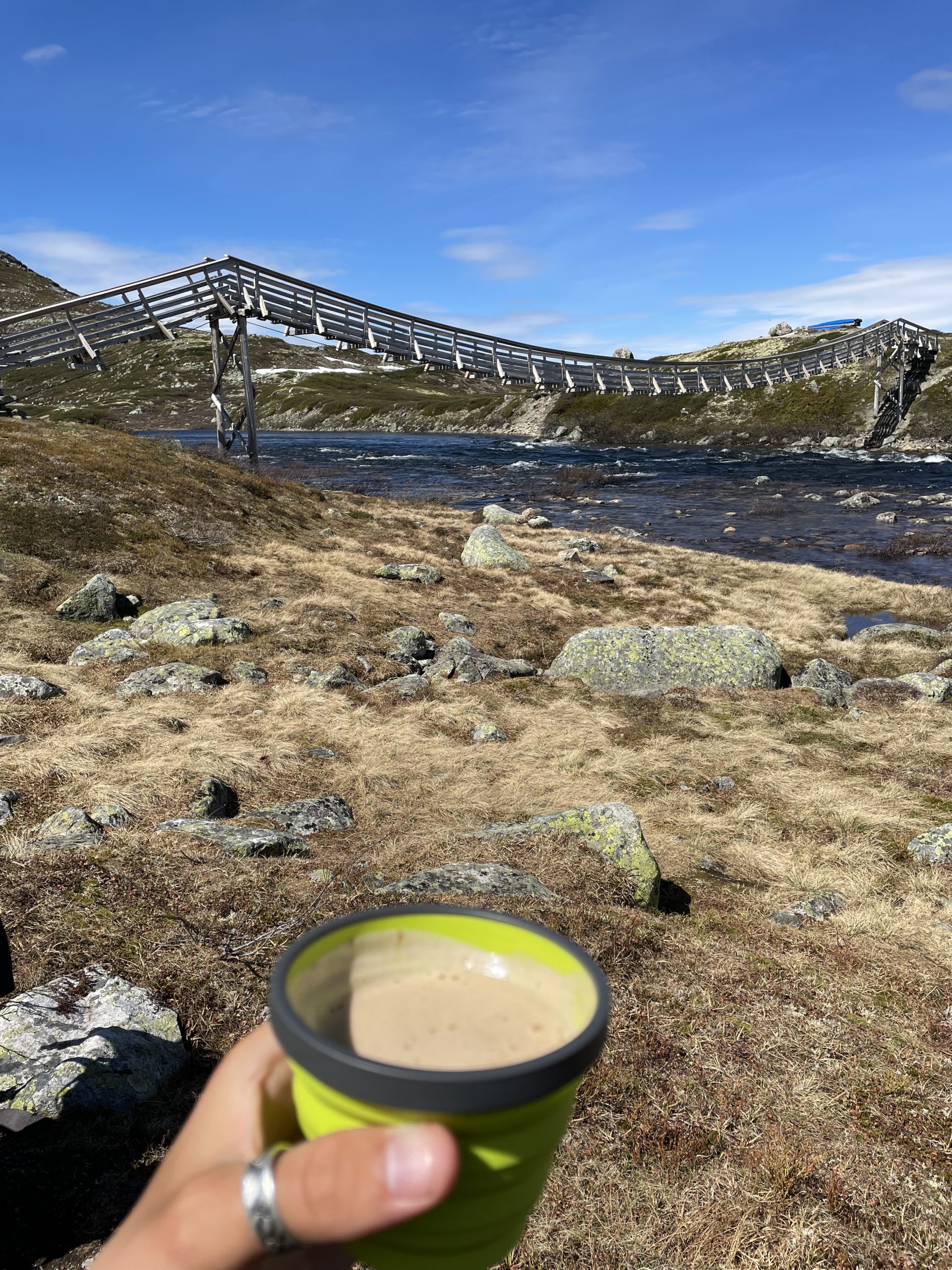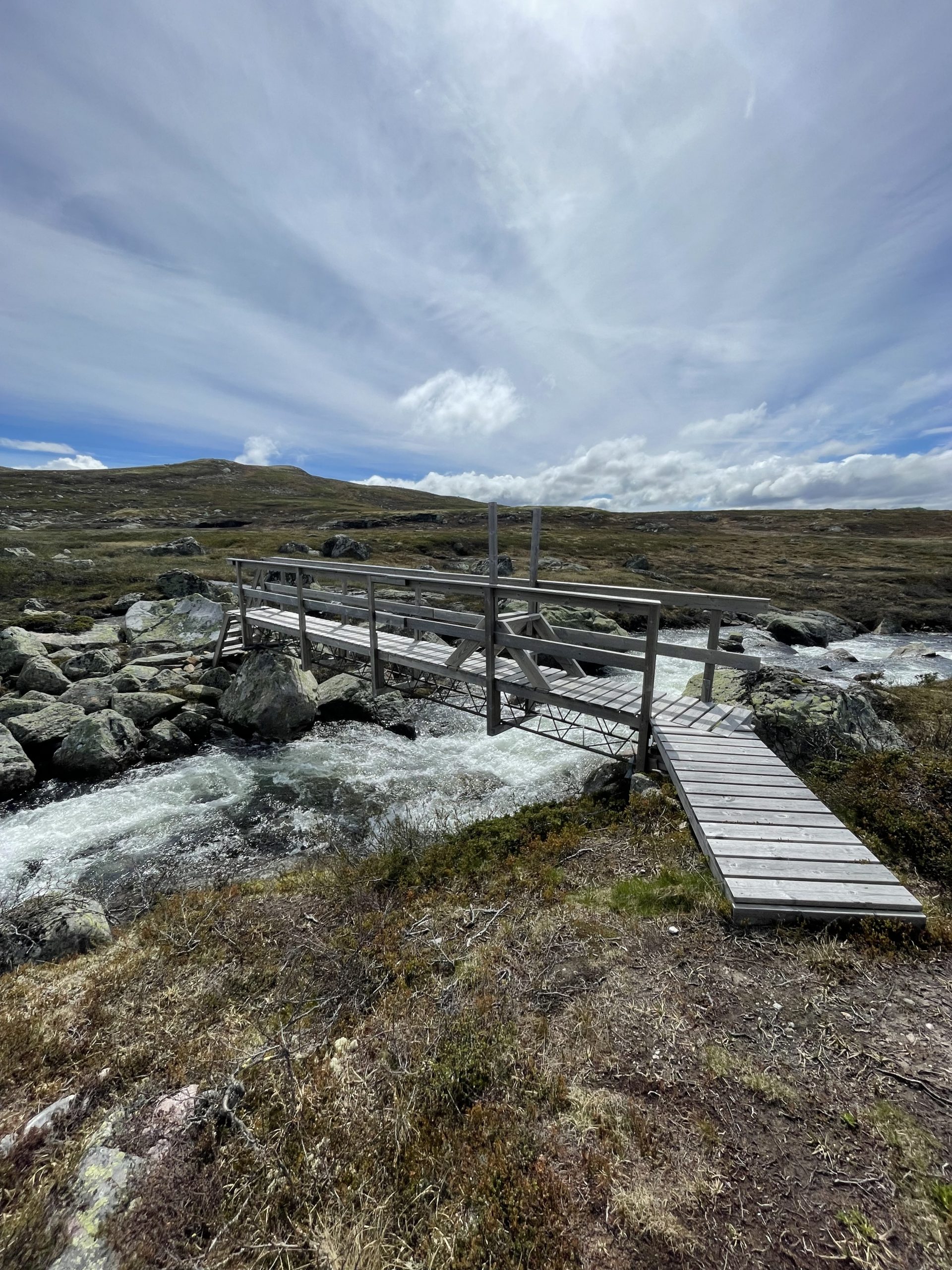 Nach einem kurzen Besuch im Supermarkt, um endlich mal noch Sonnencreme zu holen (ja Sonnencreme, es soll ja auch bald mal wirklich Sommer hier werden), geht es los und der Weg nach oben ist… naja, nett ausgedrückt anstrengend. Durch den vielen Regen der letzten Tagen hat sich der Pfad nach oben in einen Bach verwandelt und trockene Schuhe sind schon nach 100m n Wunschgedanke geworden. Aber ich kämpf mich Meter für Meter nach oben! Auf dem Weg zur Gipfelstation der Seilbahn (ja, ich hätte auch Seilbahn fahren können, aber das wäre ja bescheißen, Ich will den ganzen Weg aus eigener Kraft schaffen!) bin ich dann noch an den Spiegeln vorbei gekommen. Auch nett, dass System mal aus der Nähe zu sehen, insbesondere mein Maschinenbauer-Herz schlägt da schon ein bisschen höher. Endlich an der Gipfelstation angekommen gönne ich mir dann noch ein letztes reichhaltiges Mittagessen und dann geht es endlich in Richtung Hardangervidda! Die Landschaft ändert sich Schritt für Schritt zum weiten Fjell und diesmal mit so einer Weite, dass ich mehrfach stehen bleiben muss um den Moment wirken zu lassen. Da werd auch ich ein bisschen emotional. Sooo lange hab ich mich auf diese Gegend gefreut und jetzt steh ich plötzlich mittendrin, unglaublich!