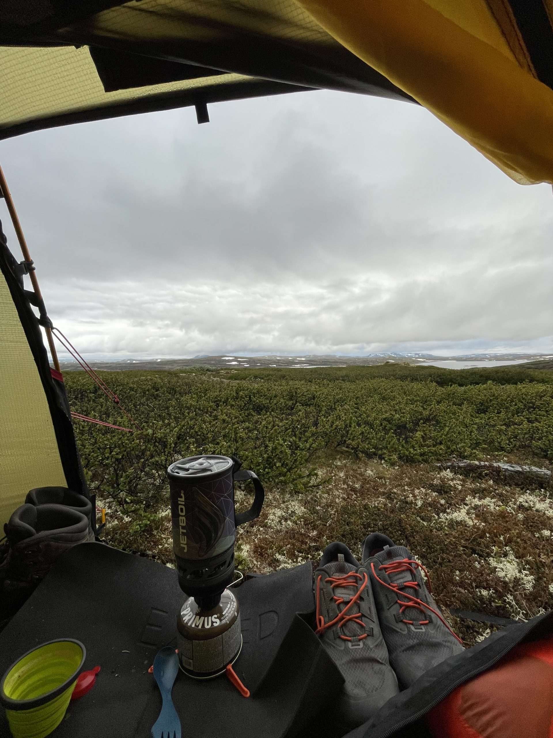 Die Nacht war spannend! Wie vorhergesagt kam der Regen gegen 23Uhr übers Fjell gezogen und das zusammen mit ordentlichem Wind. Ich bin wirklich froh darüber bei der Zelt Auswahl keine Abstriche gemacht zu haben und ich mich für das hervorragende Hilleberg Soulo entschieden habe. Trotz heftigen Böen fühle ich mich sicher aufgehoben. Allerdings ist der Geräuschpegel schon so ne Sache wenn’s draußen mal richtig abgeht. An ruhigen Schlaf ist da erstmal nicht zu denken. Demnach war die Nacht doch recht kurz, aber da der Regen sich erstmal festgesetzt hat, hab ich mich dazu entschieden, den heutigen Start seeehr lang rauszuziehen. Also genug Zeit um noch etwas Schlaf nachzuholen.