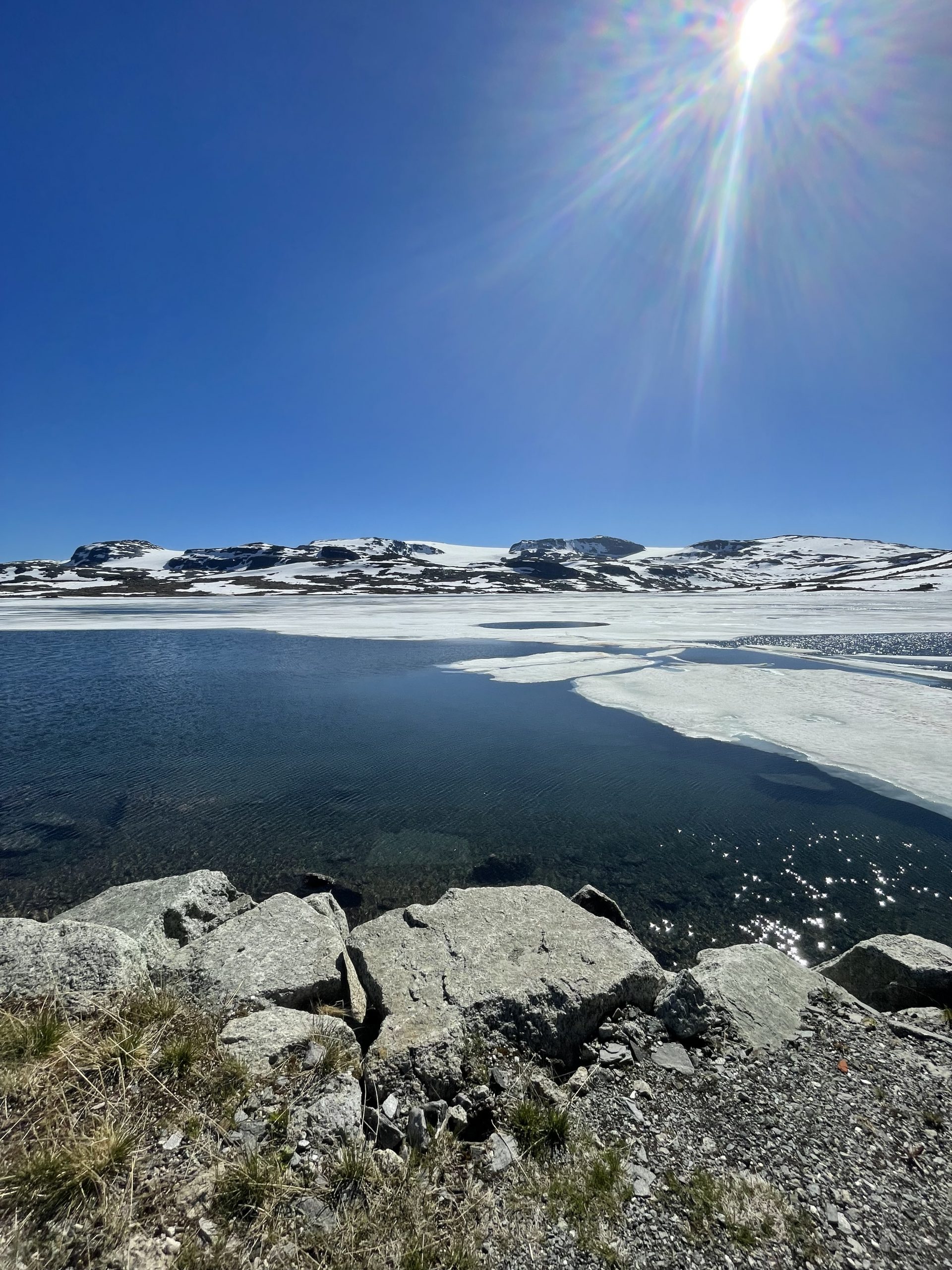 Finse wäre auch ein Durchgangspunkt einer alternativen Route von mir gewesen (westliche Hardangervidda), aber ich bin froh den anderen Weg über die östliche Hardangervidda gewählt zu haben. Die Schneemassen die hier noch liegen sind ordentlich und hätten wahrscheinlich nicht viel Spaß gemacht.