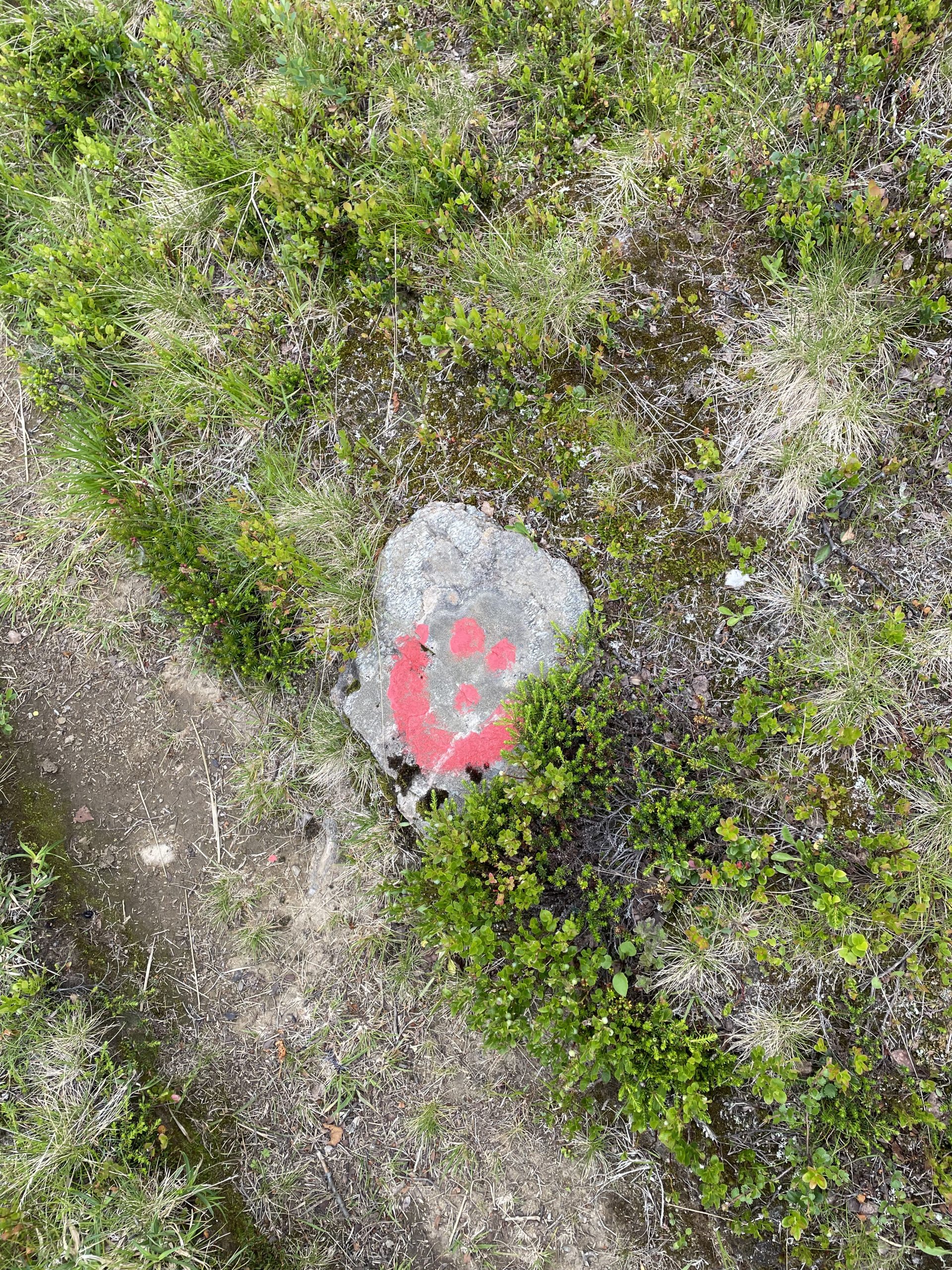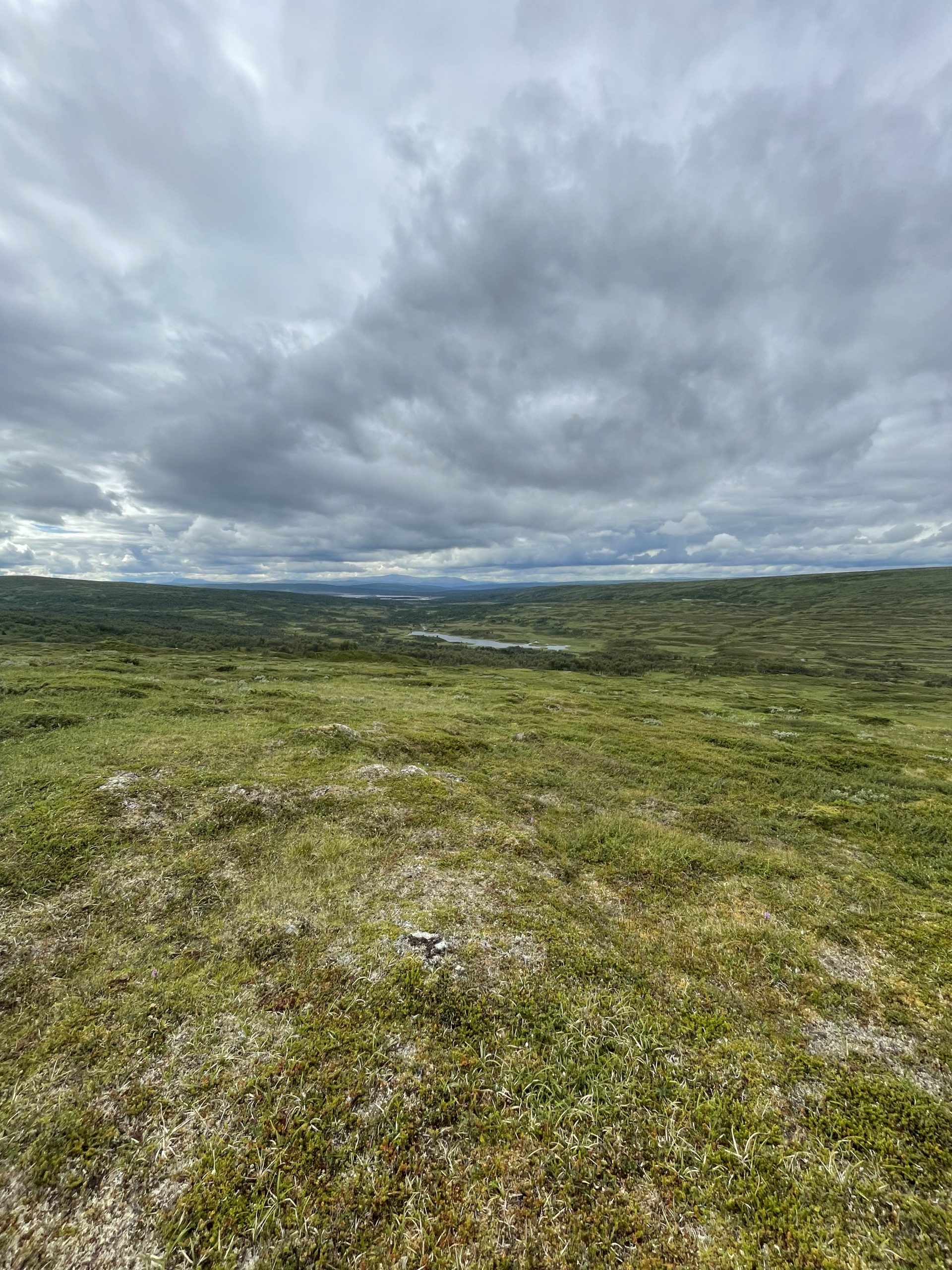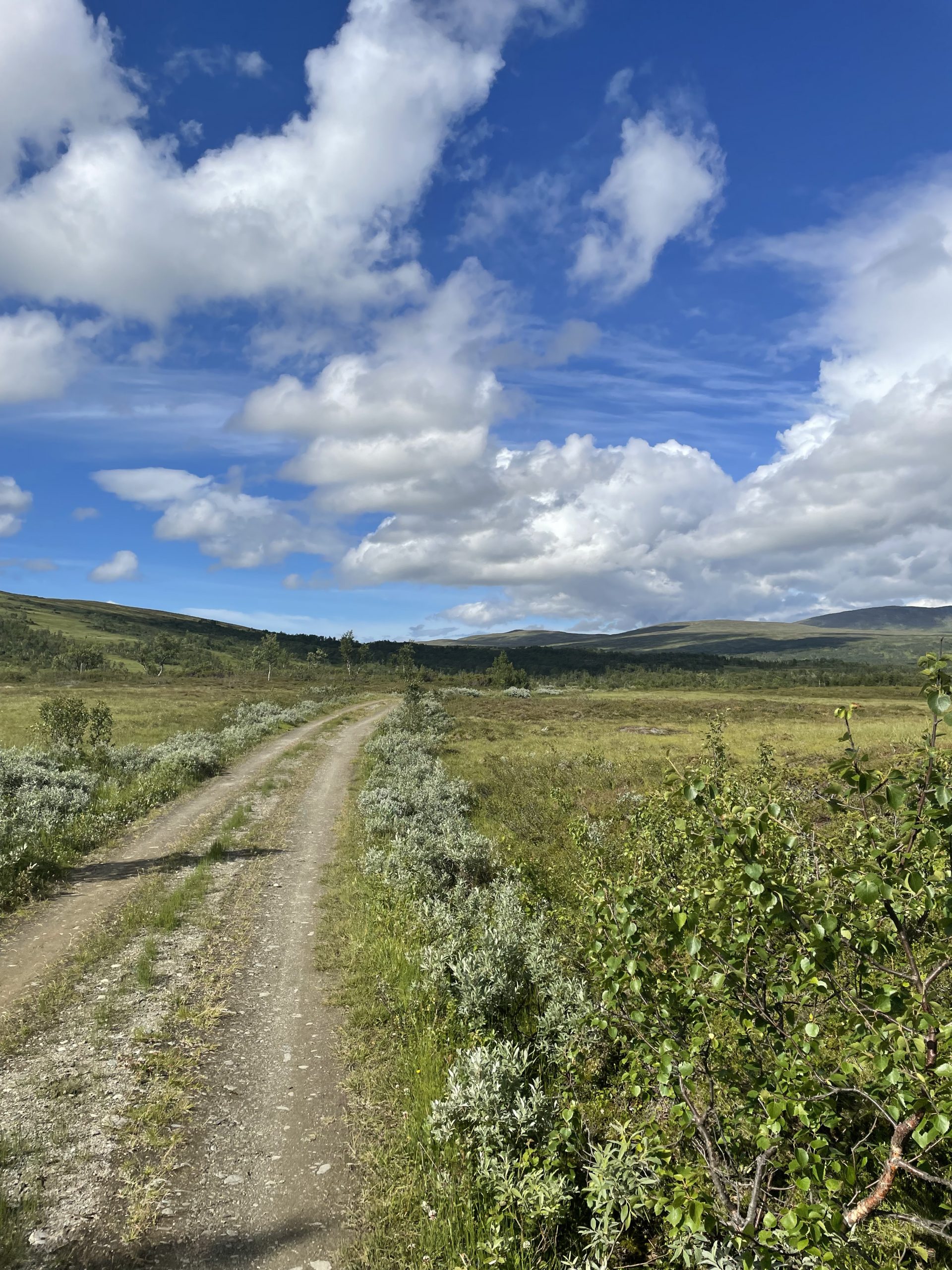 Heute geht es weiter gen Norden zu nächsten Hütte Bjørneggen, welche ich letztendlich aber sogar übergehe, da die Hütte nicht wirklich schön liegt und es drinnen eher nach Familienfest als nach gemütlichem Hüttenabend aussieht. Nach dem großen Trubel der letzten Tage auf den Hütten ist meine soziale Batterie doch sehr ausgeschöpft. Die Entscheidung fällt also auf Zelten! Bis dahin hat sich das Trøndelag (so heißt die Gegend hier in Norwegen) aber von seiner sumpfigsten und mückenreichsten Seite gezeigt… Bei fast 30 Grad und purer Sonne (übers Wetter beschwer ich mich aber ned!), fühlt man sich unter der 3cm Schicht von Sonnen- und Mückenschutz schon ein wenig… bah! Die Gegend hier liegt eben deutlich tiefer als bisher, meistens auf max. 500-600 Meter und den Unterschied merkt man wie Tag und Nacht! Hier ist Hochsommer!