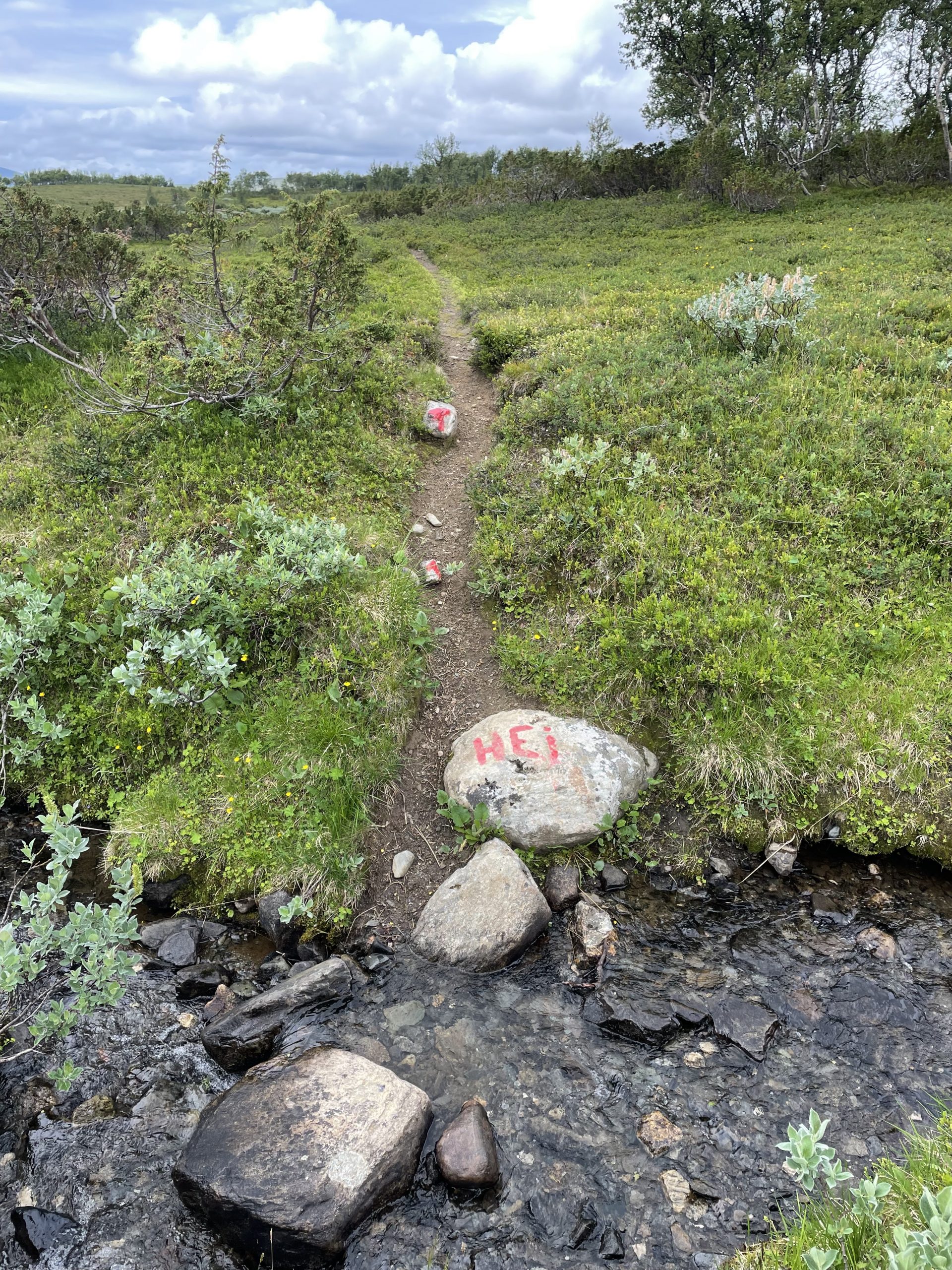 Der Weg heute ist laaaang… am Ende 34km lang. Viel Schotterstraße und am Ende den matschigsten Wanderweg seit langem. Inklusive kurzer Verirrung, weil ich Profi mich dazu entschieden habe dem E1 Fernwanderweg auf der Karte folgen zu wollen… Gaaanz blöde Idee! Diesen „Wanderweg“, welcher in seiner Gesamtheit vom Nordkap bis nach Sizilien verläuft, gibt es zu großen Teilen nur als Theorie auf der Karte. Wenn man ihm stur folgen würde… viel Spaß beim Bad im Gebirgsbach. Sieht auf dem Track aber lustig aus! Ich hab ne Weile gebraucht um den Weg übern Fluss zu finden und währenddessen vermutlich auch das ein oder andere Mal geflucht. Insbesondere deswegen, weil ich zeitlich spät dran war und das Risiko bestand, dass ich das Abendessen an der Nedalshytta verpassen könnte. Das wird auf den bedienten Hütten immer zu festen Uhrzeiten serviert. Nachzügler bekommen zwar auch immer noch was zu essen, aber so eine „Extrawurst“ will ich dann doch lieber vermeiden.