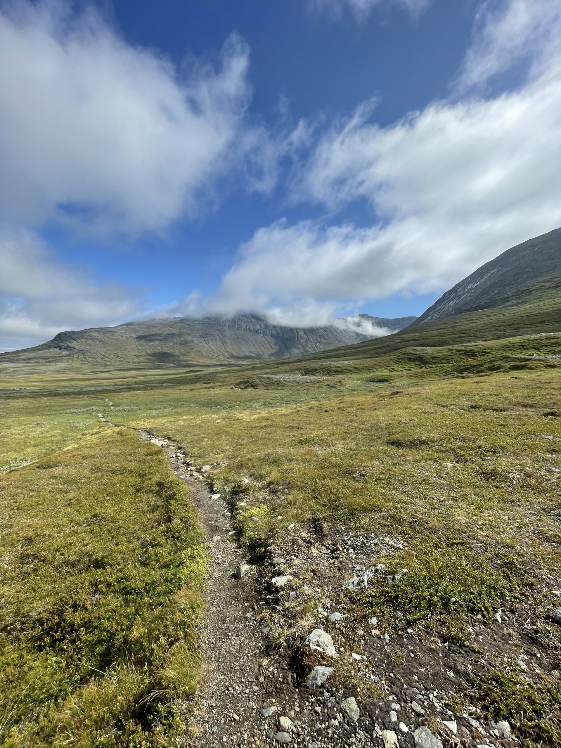 Nach dem Zeltabbau geht es an die 12km wegloses Fjell! Zunächst führt noch ein kleiner Pfad den Hügel hinauf, aber plötzlich verschwindet auch der. Auf einmal steht man da und fühlt sich ein kleines bisschen verloren. Okay, kein Problem! Ein Blick auf die Karte, ein paar Checkpoints gesetzt und die Richtung steht! Tatsächlich klappt das auch recht einfach in der Gegend. Es ist nicht viel im Weg, was den Blick auf den nächsten Gipfel, Fluss oder was auch immer der Fixpunkt ist, versperrt. Es gilt nur ein paar sumpfige Stellen zu umgehen und nicht gedankenverloren über ne Klippe zu rollen. So laufen sich die 12 km echt gut! Am Ende des Abschnitts soll laut Karte ein See mit einem Damm an der Spitze sein. Das muss ich drüber und schon bin ich wieder auf dem Wanderweg. Ja, der Damm ist auch da, aber es ist irgendwie kein Damm, welcher zum drüber laufen gemacht ist… Ooookay, die Füße sind eh heiß gelaufen, also gibt’s eben ne Einheit Balancieren auf dem Wasserbarren! War auch halb so wild und vielmehr eine erfrischende Wohltat als ein Hindernis.